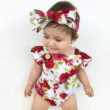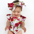 Lovely baby onesie and ribbon headband 2 piece set features all-over graphic floral rose print for newborn & infant girls. Shoulder button for easier dressing. Ruffle sleeve style bodysuit for a stylish look. Elastic trimming for comfort fitting. Made from softest cotton kind to young skin. Clothing is machine wash safe. More sizes are available for this baby clothing set.