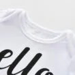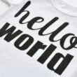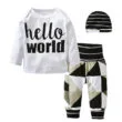 Cute baby T-Shirt, jogger pants, and beanie hat 3 piece sleepwear set features “Hello World” quote with graphic printing on pants and stripe pattern on hat for newborn & infant boys and girls. Long sleeve Tee to stay warm. Envelope neck shirt stretches easily over head. Pull-on jogger pants with elastic waistband for easy wearing. Banded cuffs to keep sleeve from riding up. Soft cotton material ideal for young skin. Clothing is machine wash safe. More sizes are available for this baby clothing set.