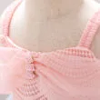Beautiful baby princess wedding crochet bodice ballgown tailored for infant and toddler girls. Sleeveless gown appropriate for any occasion such as birthday and wedding. Colorful flower blossom attached on bodice with a sheath of lace around the shoulders. Matching rainbow colored shoulder straps and skirt. Rear zip up closure for easier fitting and dressing. Cinched waist with large ribbon bow attached on the back. Large ruffled tulle along the skirt, giving a flaring effect. Soft blend of synthetic fabric ideal for young skin. Clothing is for hand wash or dry clean only. More sizes and colors are available for this baby clothing set. See more wedding crochet bodice ballgown from our “Wedding” category of baby dress.