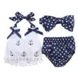 Lovely baby crop top, bloomers, and ribbon bow headband 3 piece set features all-over graphic sailor anchor print on top and polka dot pattern on bottom. No sleeve shirt with only a ribbon tie knot on neck for easy dressing. Elastic band along chest for comfort fitting. Cute little ribbons attached on front. Tassel finishing along trimmings of hem. Pull-on diaper covers with elastic waistband for easy wearing. Soft cotton material ideal for young skin. Clothing is machine wash safe. More sizes are available for this baby clothing set.