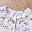 Adorable baby rainbow print jumpsuit tailored for newborn, infant, and toddler boys & girls. Long sleeve all-over rainbow & hearts pattern one-piece to keep little ones warm during naps. Banded cuffs to keep sleeves from riding up. Front snaps closure for quick dressing and diaper changing. Outfit comes with matching ribbon bow headband. Made from softest cotton against delicate skin. Clothing is machine wash safe. More sizes are available for this baby clothing set. See more rainbow print jumpsuit from our “Jumpsuit” category of baby wear.
