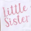 Adorable bodysuit, sweatpants, and ribbon headband 3 piece sleepwear set features “Little Sister” text print on onesie and floral printing on pants for newborn & infant girls. Long sleeve bodysuit to keep active arms warm. Creeper with expandable shoulders for easy over the head fitting. Crotch-snap closure for easier diaper changing. Nickel free metal snaps to prevent skin irritation. Pull-on jogger pants with elastic waistband for easy wearing. Banded cuffs to keep sleeve from riding up. Soft cotton material ideal for young skin. Clothing is machine wash safe. More sizes are available for this baby clothing set.