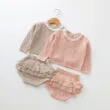 Lovely baby knit sweater and diaper covers 2 piece set for newborn & infant girls. Long sleeve plain solid color sweater. Crewneck neckline with lace for a cozy fit. Pull-on diaper covers with stretchy waistband for quick fitting. Ruffle lace on bloomers shorts. Made from softest woven against delicate skin. Clothing is for hand wash only. More sizes and colors are available for this baby clothing set.