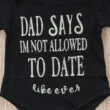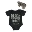 Funny baby bodysuit 2-piece set with leopard ribbon headband. Bodysuit outfit features quote on Dad says I’m not allow to date like ever, for newborn & infant girls. Short sleeve onesie for warmer weather. Envelope neck stretches easily over head. Crotch-snap closure for easier diaper changing. Nickel free metal snaps against delicate skin. Made from softest cotton against delicate skin. Clothing is machine wash safe. More sizes are available for this baby clothing set.