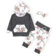 Lovely baby hoodie sweatshirt, jogger pants, and ribbon headband 3 piece tracksuit set features floral flower print for newborn & infant girls. Long sleeve hooded sweatshirt to stay warm. Front kangaroo pocket to keep your hands warm. Banded cuffs to keep sleeve from riding up. Pull-on style jogger pants with drawstring for easy dressing. Soft cotton material ideal for young skin. Clothing is machine wash safe. More sizes are available for this baby clothing set.