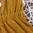 Lovely baby ruffle one-piece suspender romper with lace and tie back for newborn & infant girls. Sleeveless outfit for warmer weather. Cinched waist for a cozy fit. Ribbon tie back for quick dressing. Soft cotton material ideal for young skin. Clothing is machine wash safe. More sizes are available for this baby clothing set.